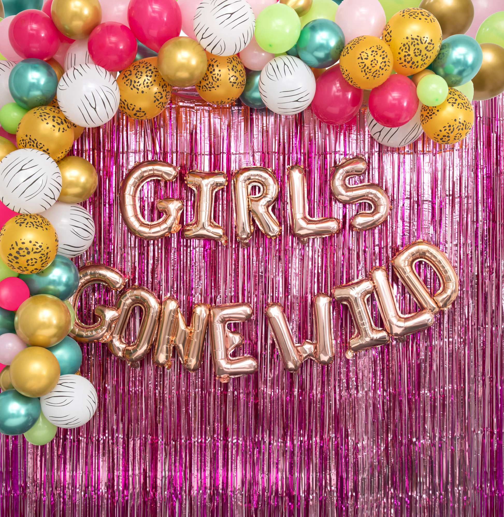 WILD CELEBRATION AHEAD- Turn your bachelorette party into a jungle paradise with our Girls Gone Wild decoration set. Featuring safari animal print balloon garland, Girls Gone Wild foil balloons, and a pink photo backdrop