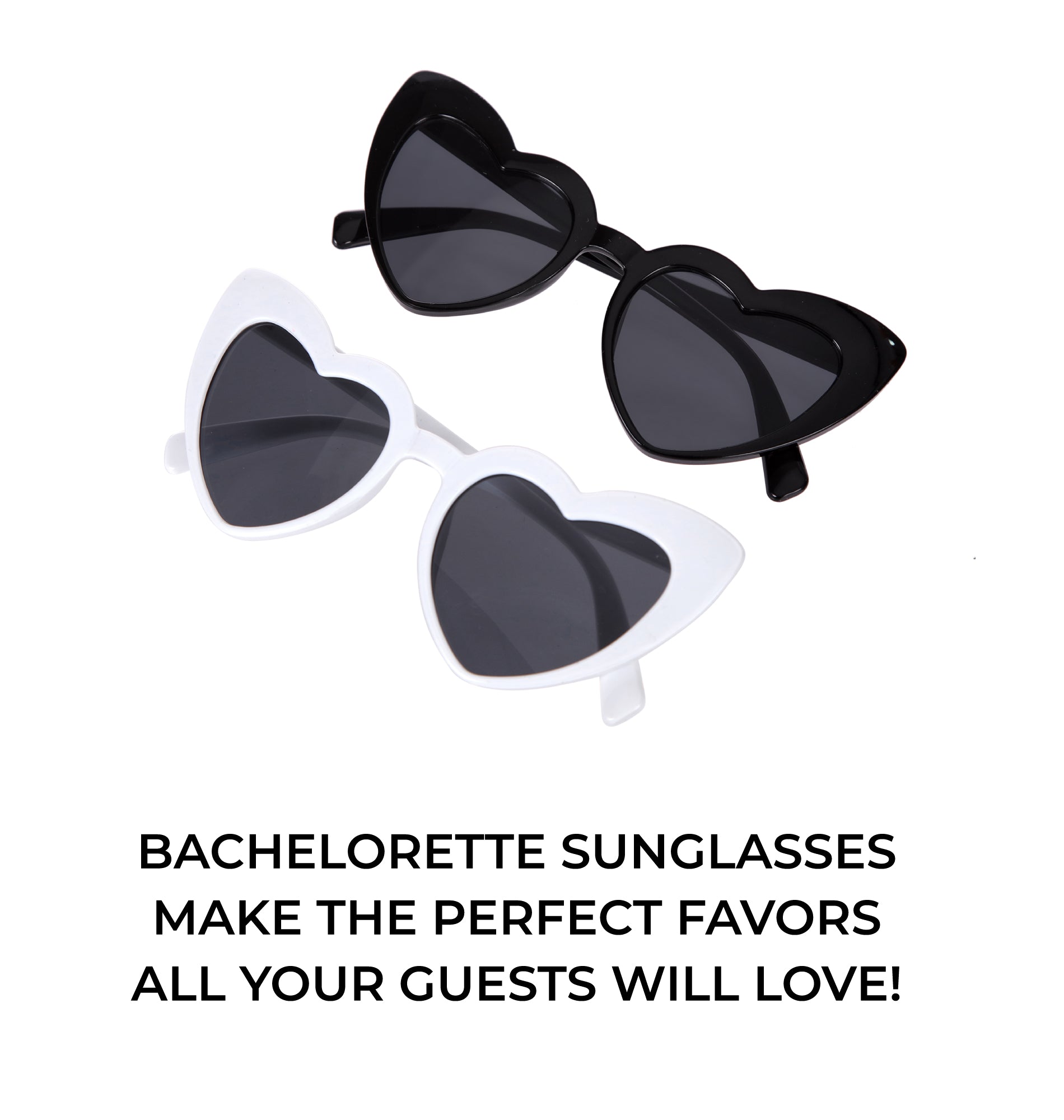 🕶️ OUR SUPER STYLISH BACHELORETTE PARTY SUNGLASSES come in packs of 7 or 12 - 1 special pair of white heart sunglasses for the beautiful bride-to-be, and 6 or 11 shades for the rest of the bride tribe! Two cute colors now available- choose between BLACK or PINK heart sunglasses! It’s time to STRUT the streets in STYLE!
