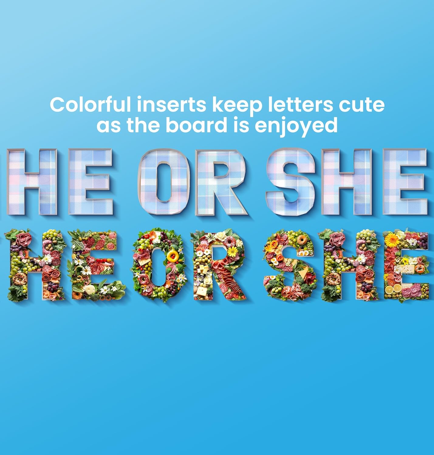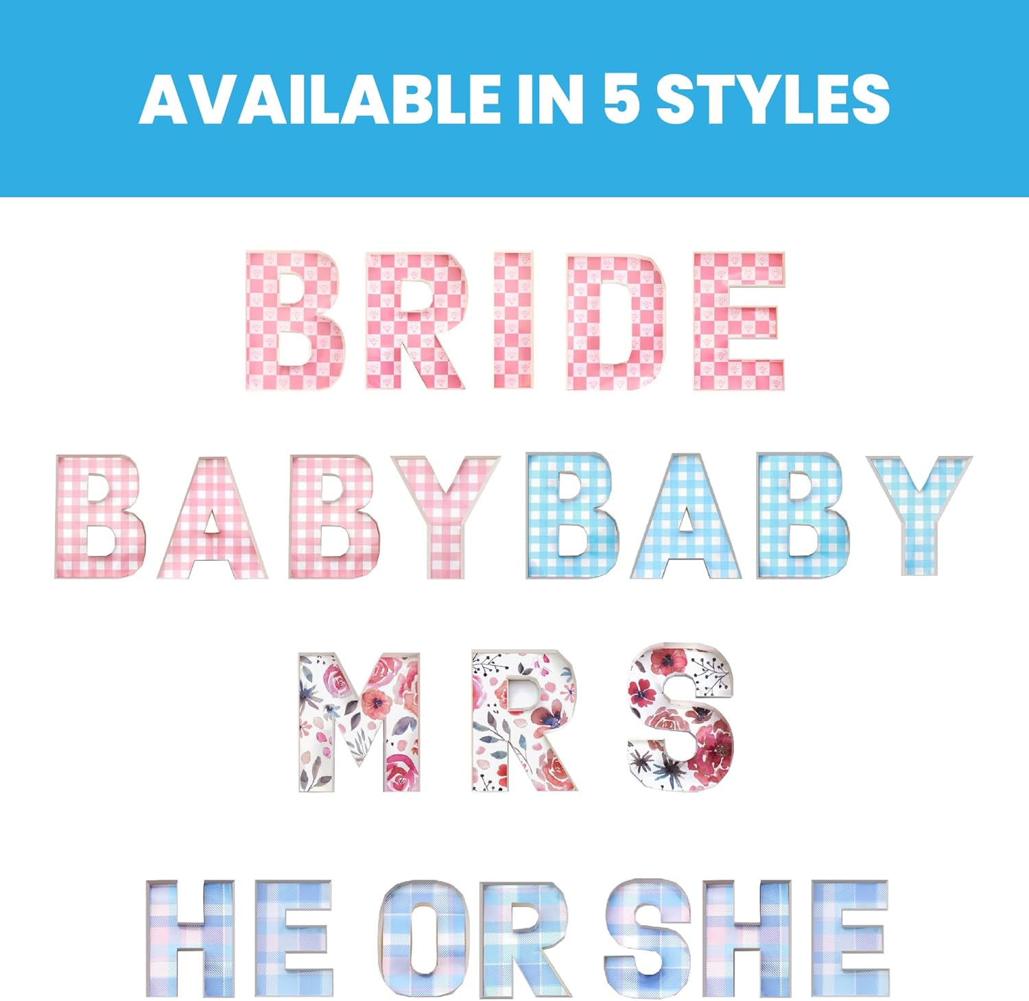 - AVAILABLE IN 5 UNIQUE SETS- MRS, BRIDE, BABY (blue) and BABY (pink) and HE OR SHE. Perfect for weddings, baby showers, and gender reveal parties, our charcuterie letter serving trays make your celebration unforgettable.