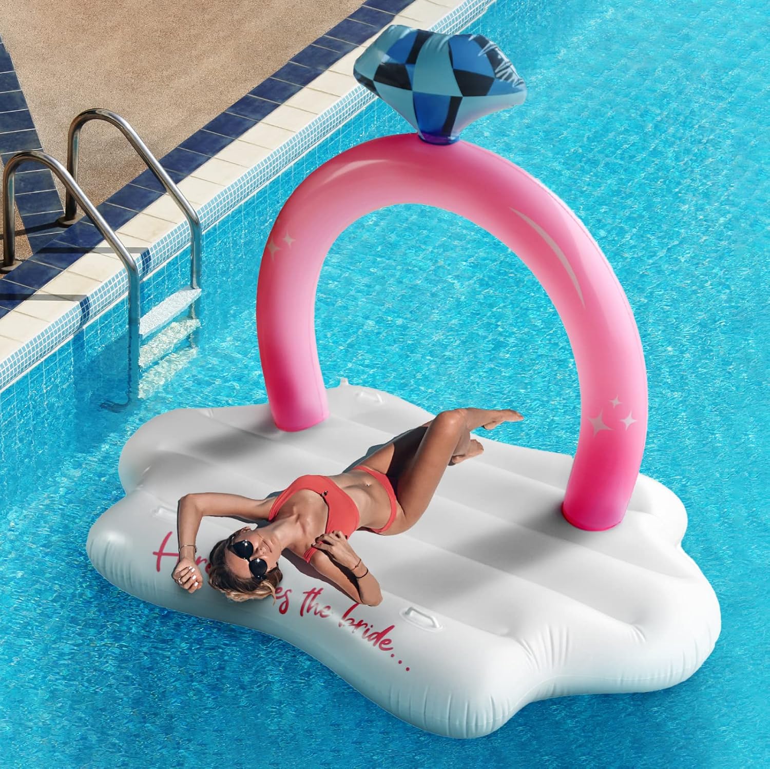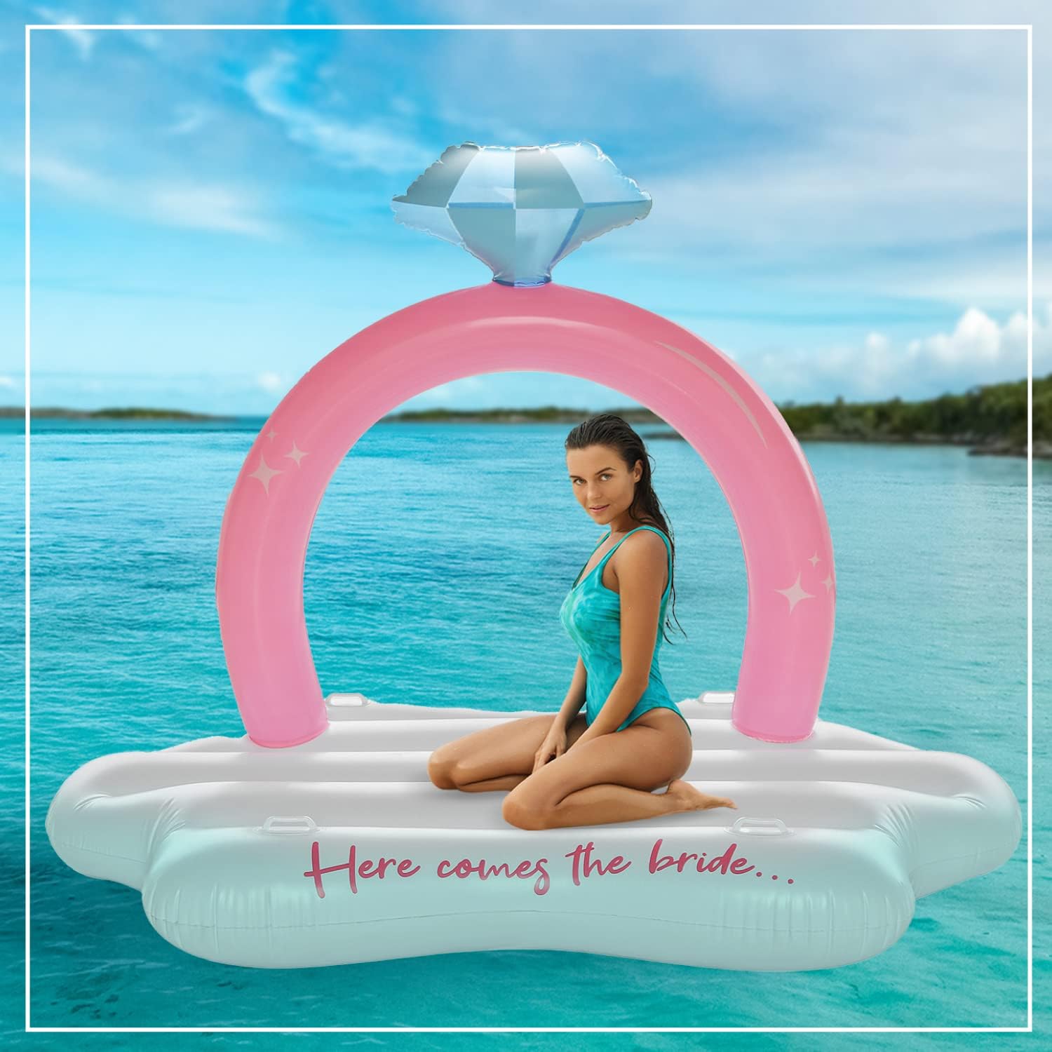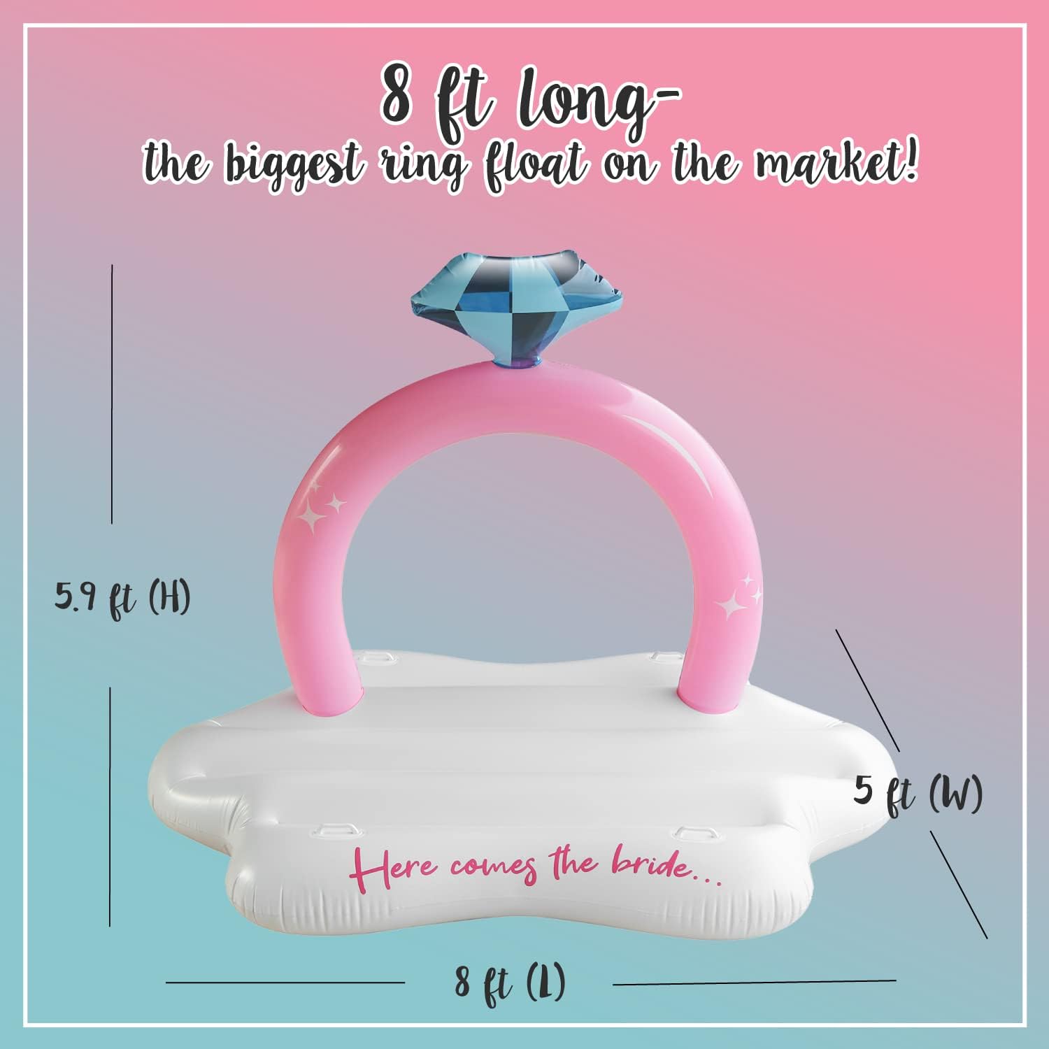 Printed with "HERE COMES THE BRIDE..." our engagement ring float is one of the best engagement gifts for the bride. It will be perfect for all of the bride's bachelorette photos! Use our engagement ring floatie pool float as the perfect bachelorette photo shoot backdrop.
